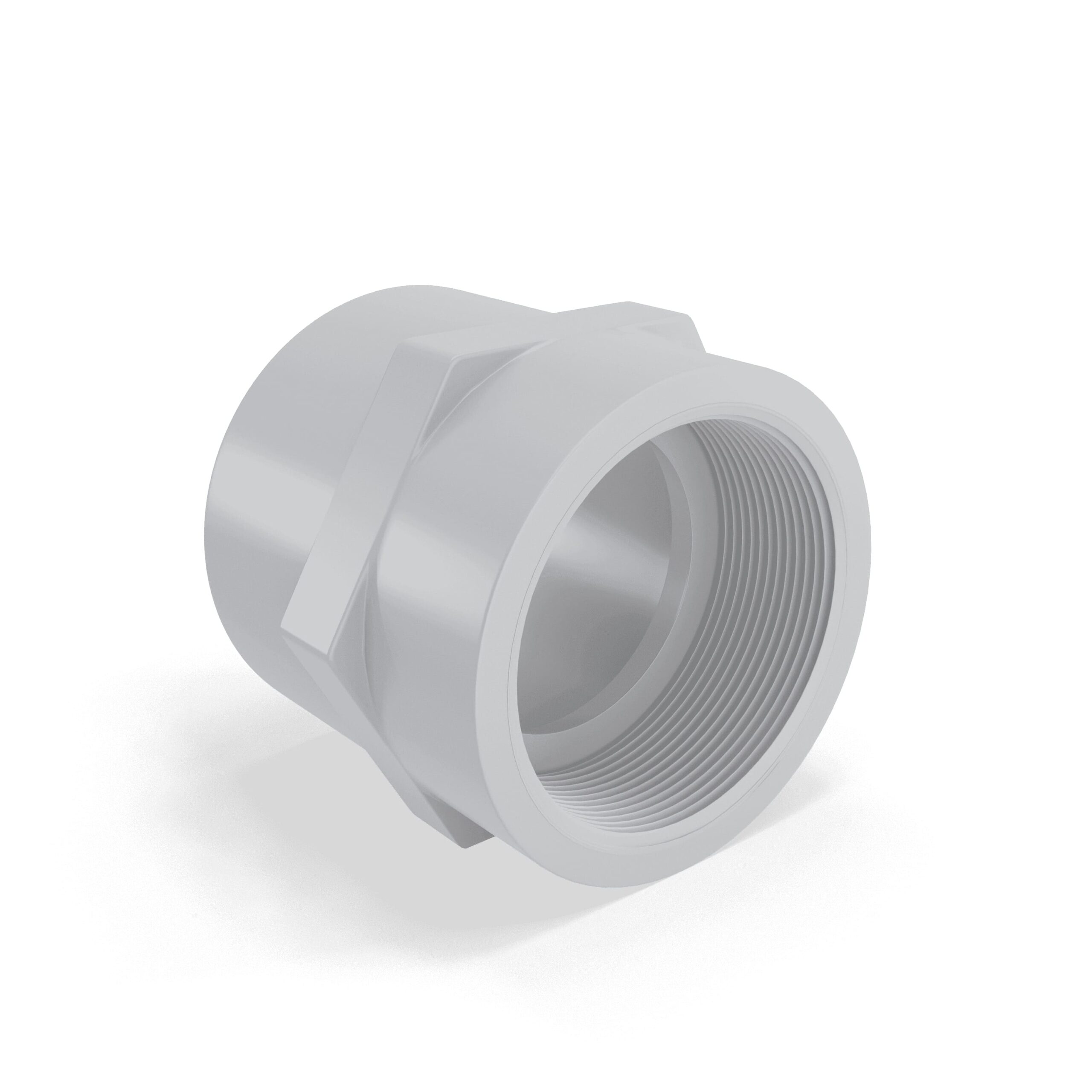 Versatile PVC female threaded adaptor designed to connect pipes or fittings with male threads, allowing smooth transitions between different pipe sizes or materials in agricultural and plumbing systems.