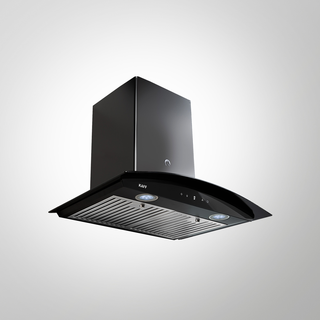 The KAFF LIZ DHC 60 / 90 chimney offers powerful suction with a maximum airflow of up to 1150 m³/h, making it suitable for thorough removal of smoke, grease, and odors in busy kitchens. Its heavy-duty stainless steel baffle filter is highly effective at capturing oil particles and is easy to maintain. Equipped with dry heat auto clean technology, the chimney reduces manual cleaning efforts by automatically removing oil buildup. The matte black rust-proof coating, curved black tempered glass design, and energy-saving frosted LED lights add style and functionality. The touch control panel with digital display and 3-speed settings allows for seamless operation with low noise of just 54 dBA. Copper-wound motor ensures durability and efficient performance.